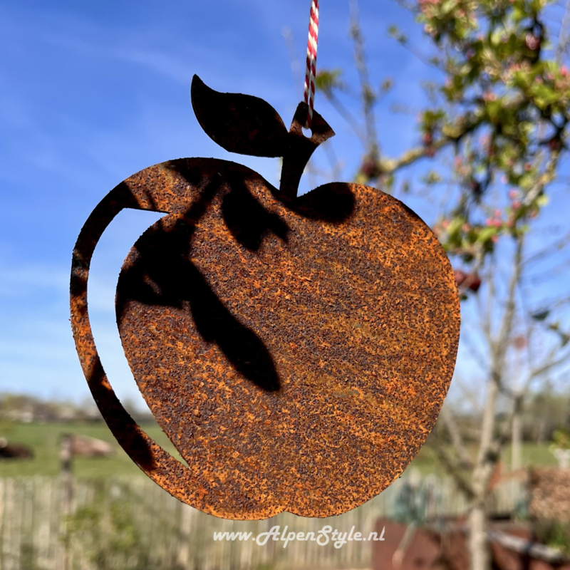 appel cortenstaal, cortenstaal appel ophangen, tuindecoratie cortenstaal boom, roestdecoratie tuin hangend, cortenstaal decoratie buiten, appel van metaal tuin, tuinbeeld cortenstaal appel, cortenstaal hangdecoratie tuin