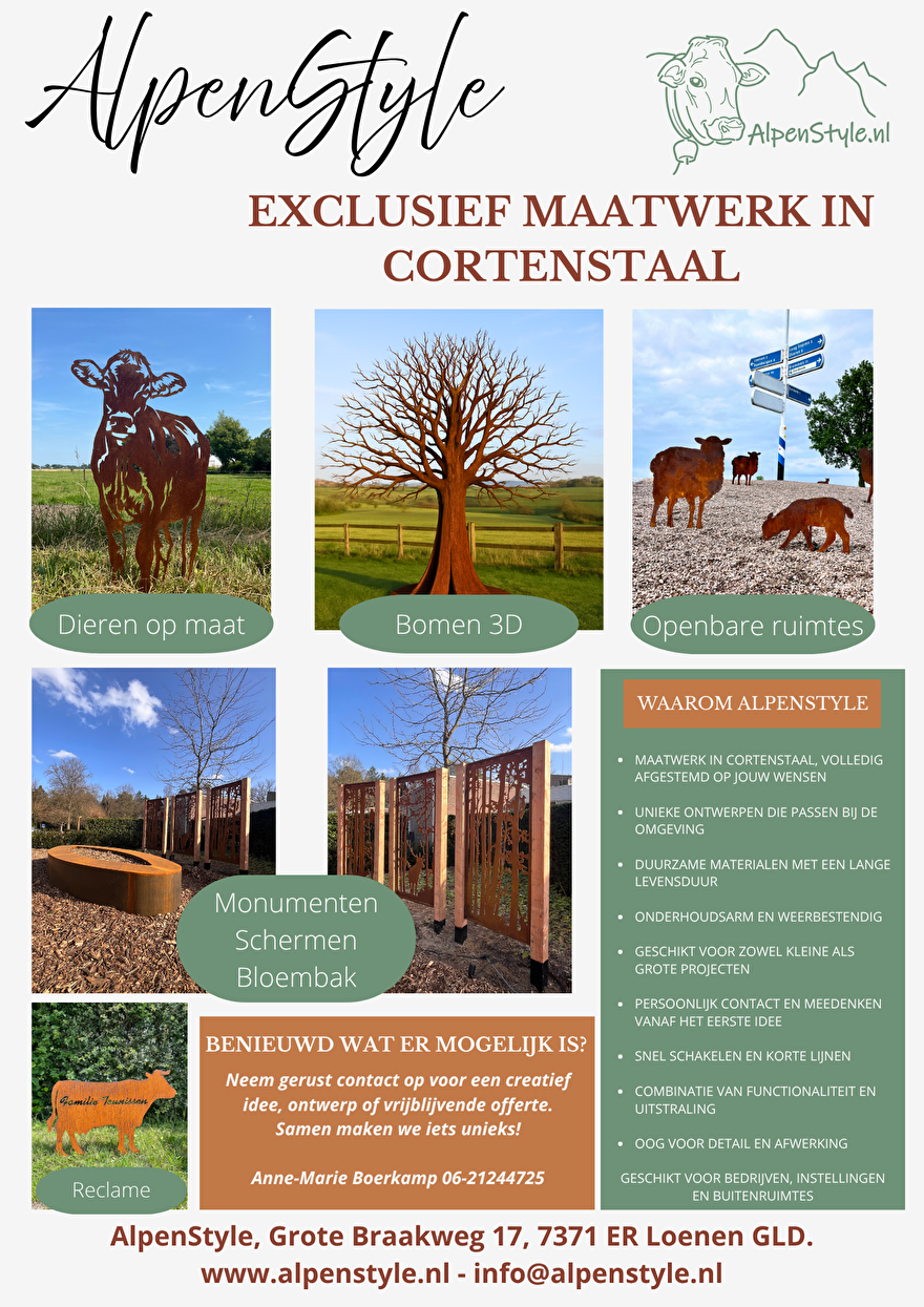 AlpenStyle ontwerpt en realiseert cortenstalen maatwerk voor bedrijven, instellingen en openbare ruimtes. Wij maken unieke ontwerpen die niet alleen functioneel zijn, maar ook bijdragen aan de uitstraling en identiteit van een locatie.